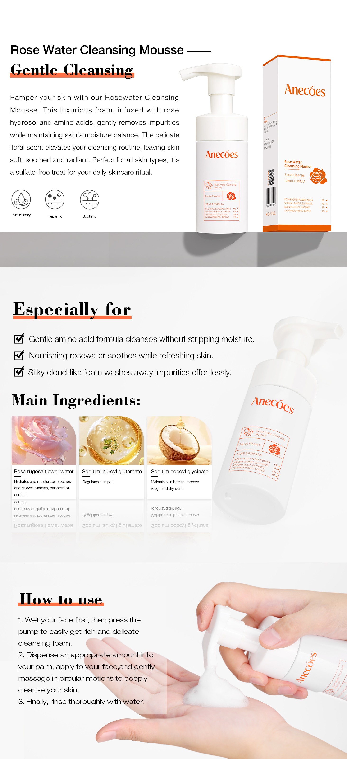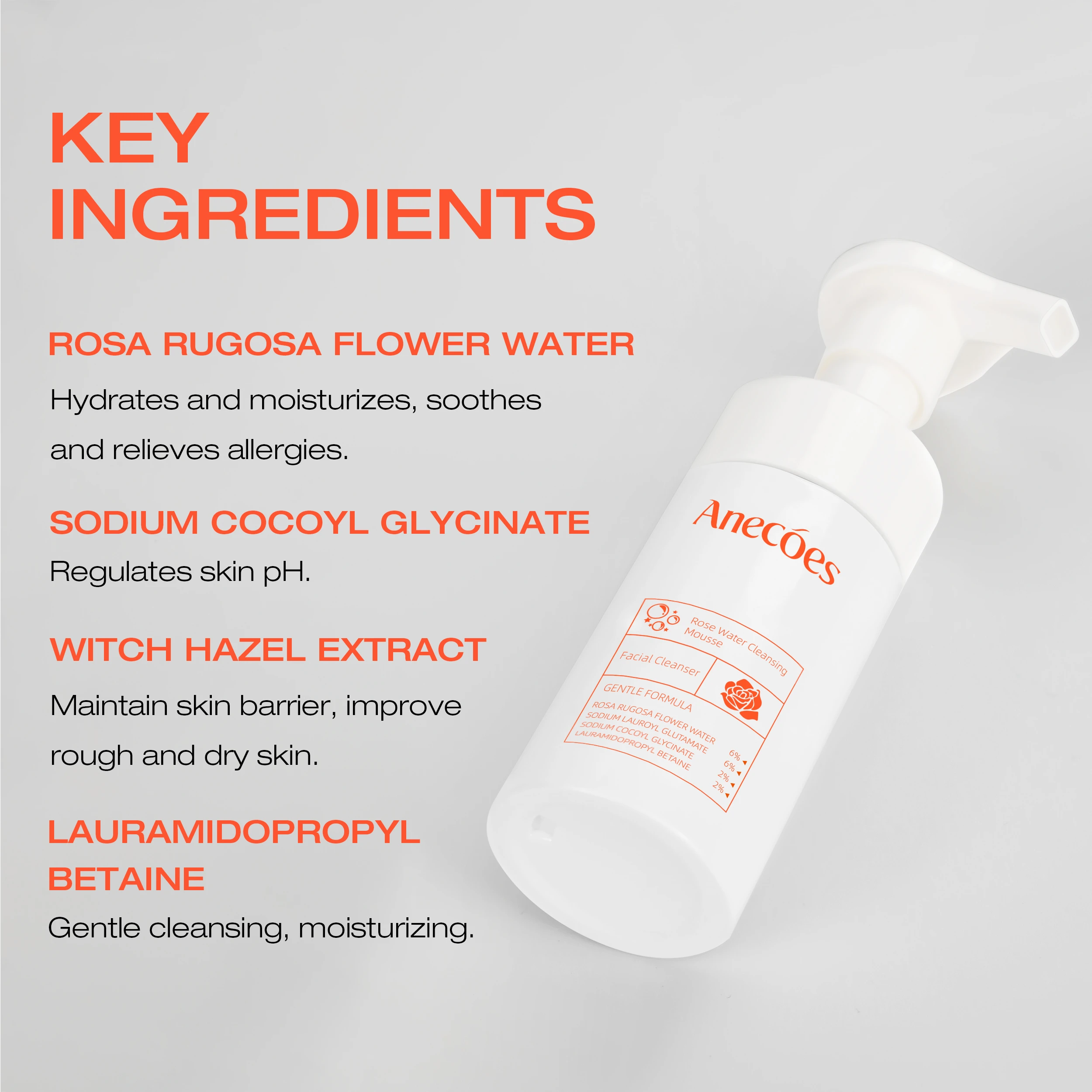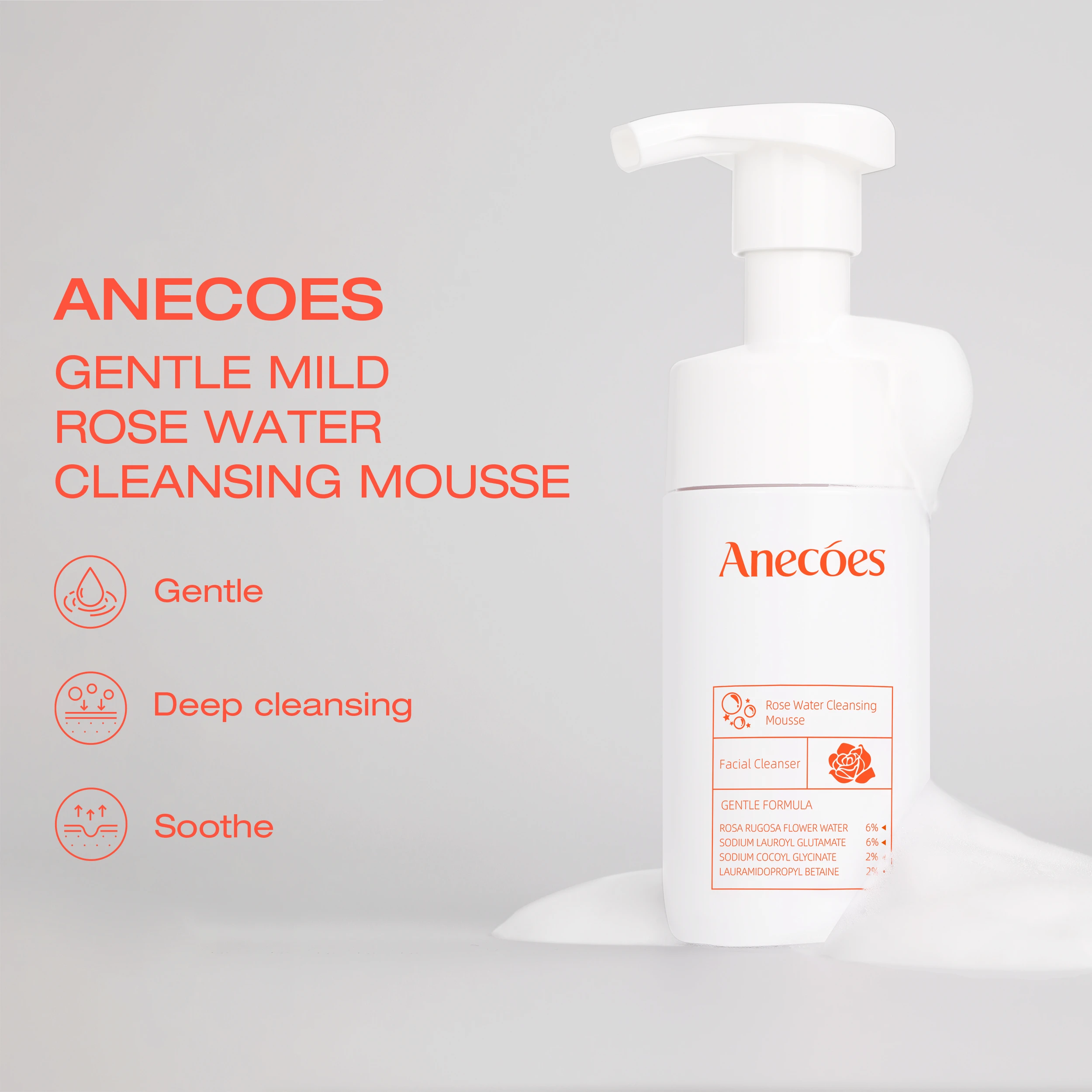 ANECOES Gentle Mild Rose Water Cleansing Mousse - Deep Cleansing Without Irritation, Hydrating, Moisturizing, Soothing, Protect Skin Barrier for Sensitive Skin, Daily Skincare for Women & Men (3.5 FL.OZ)